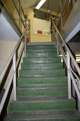 We are standing in front of the stairs leading to the second floor. Other than a small hydraulic elevator, these stairs were the only way up or down. At the top of the stairs, the viewing room is visible.