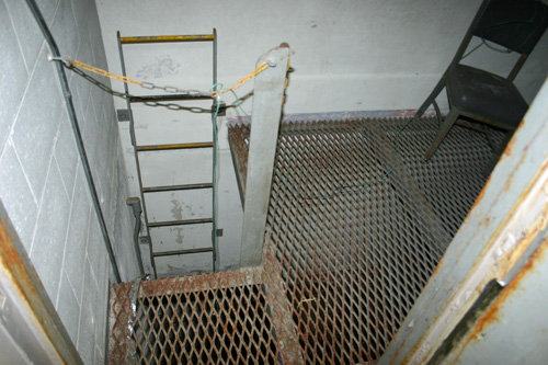 This is the escape pit on the south side of the blockhouse. A ladder leads down to an area that opens into a small tunnel. The tunnel and much of the escape pit are flooded.